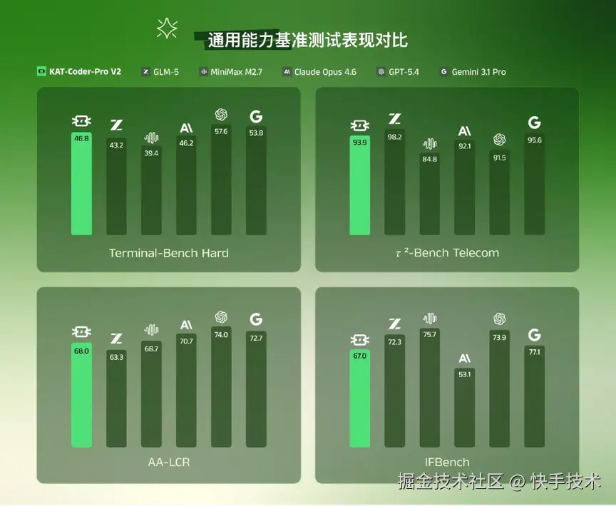 Agentic 场景下的复杂推理,离不开扎实的通用基座能力作为支撑。KAT-Coder-Pro V2 的基础模型在 Terminal-Bench Hard(46.8)、𝜏²-Bench Telecom(93.9)等主流基准上全面进入全球第一梯队,为上层 Coding 能力提供了坚实的底层保障。