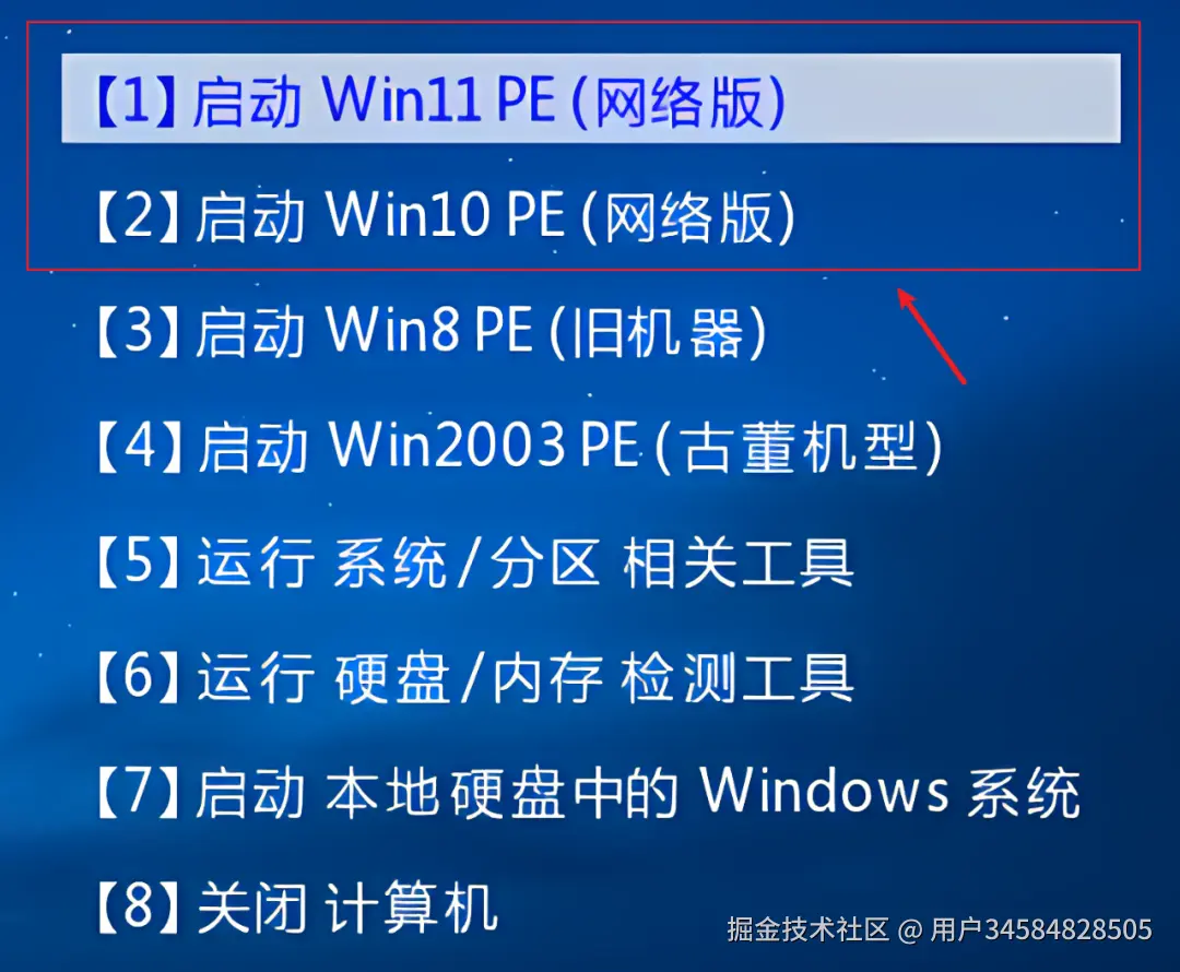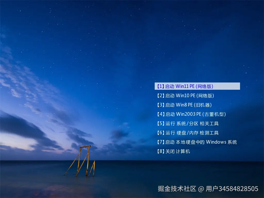 完成后,直接将该U盘连接重装电脑上,再次开机时,会自动进入引导界面,按下数字键:1,就可以打开Win11 PE系统:
