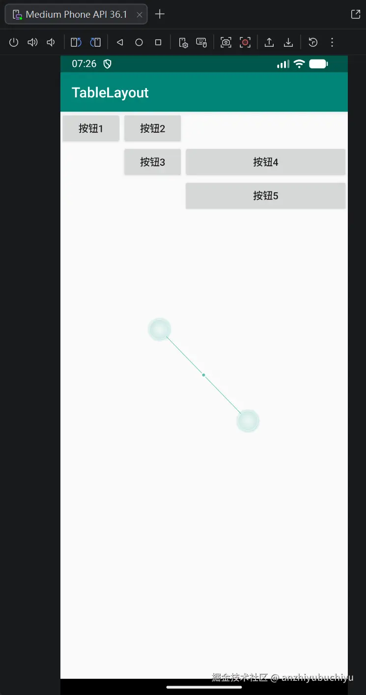 运行效果:按钮1固定在屏幕底部,按钮2在屏幕水平居中位置偏上,按钮3在按钮2的右上方位置,三个按钮位置完全通过相对关系确定。