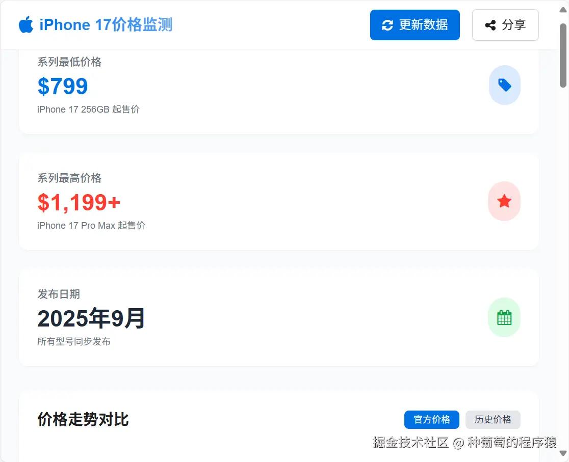 最近刚好苹果发布新iPhone,我用Bright Data MCP获取最新的iPhone 17价格信息,能实时采集且不需要我处理任何网站限制的问题,我把采集来的信息写成了一个可视化看板,用来实时监测价格信息。