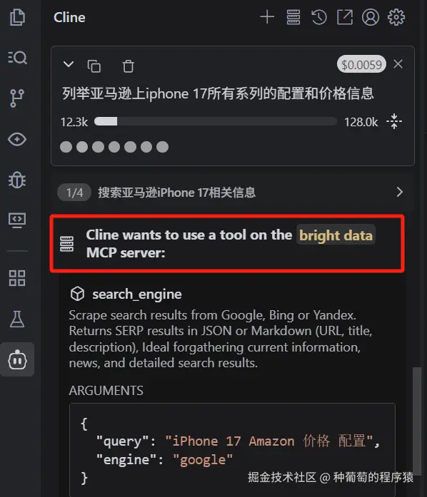 提问Cline,它会自动调用Bright Data MCP来采集数据。