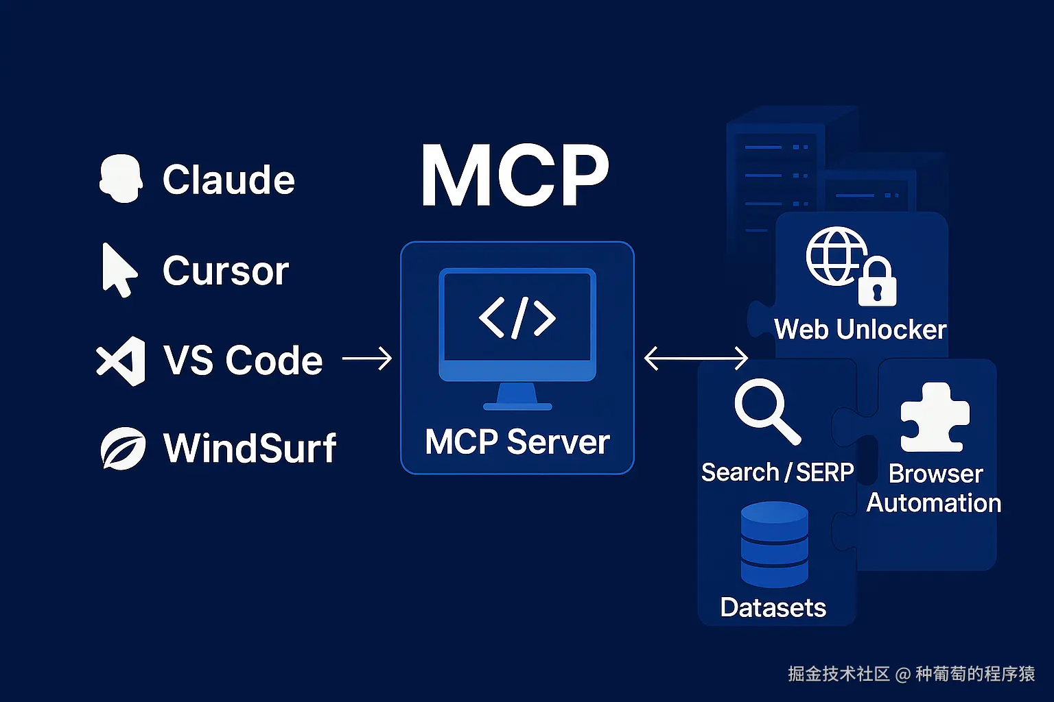 首先要介绍下什么是MCP,它的学名是“模型上下文协议”,你可以理解成它是连接AI大模型和外部工具的一个媒介,类似于电脑和互联网的关系,大模型原先只是封闭的大脑,有了MCP后它就连接了无数的信息、工具、数据,可以做更多的事情,比如Bright Data MCP能实现复杂网站的数据采集。