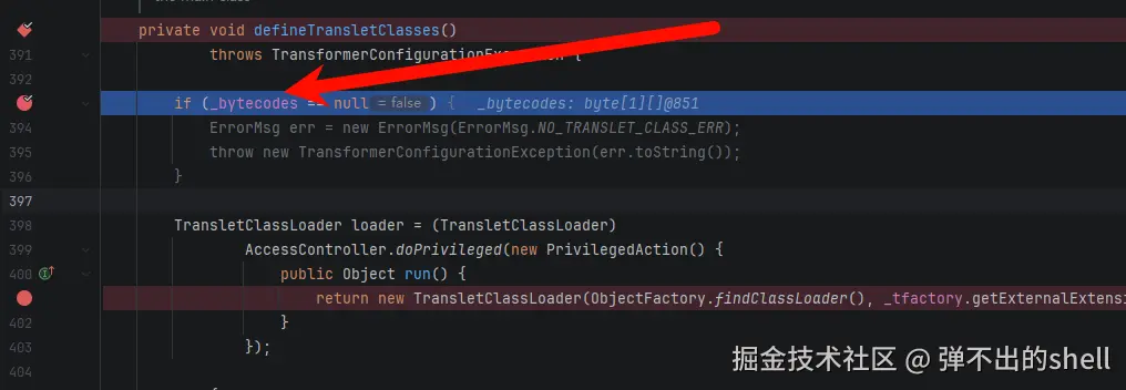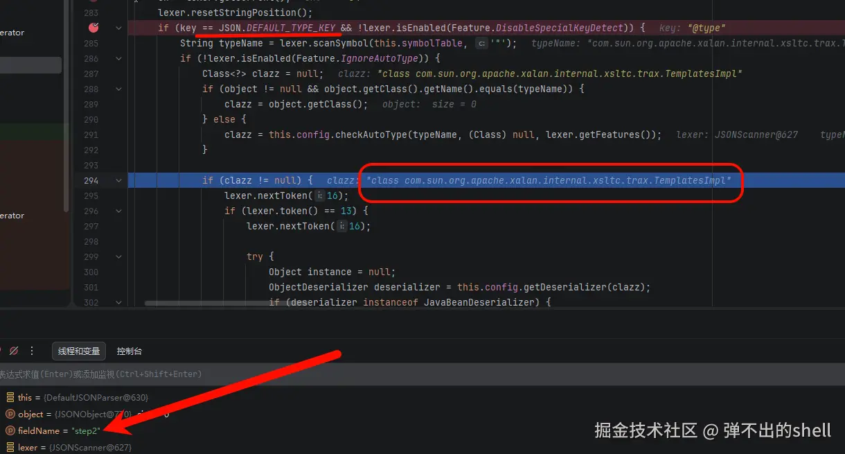 前面步骤差不多,直接跳到读取检测完 step2 的 com.sun.org.apache.xalan.internal.xsltc.trax.TemplatesImpl 值这里开始。