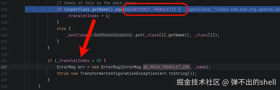 可以看到,如果检测到继承了 AbstractTranslet,_transletIndex 就不会是默认的 -1,也就不会执行下面的:
