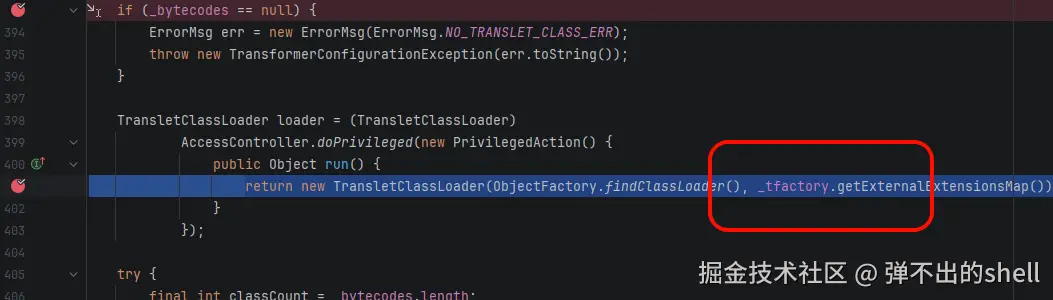 就在下面看到了参数 _tfactory 被使用,如果 Payload 里面没有赋值 _tfactory 的话就会报错(NPE)。