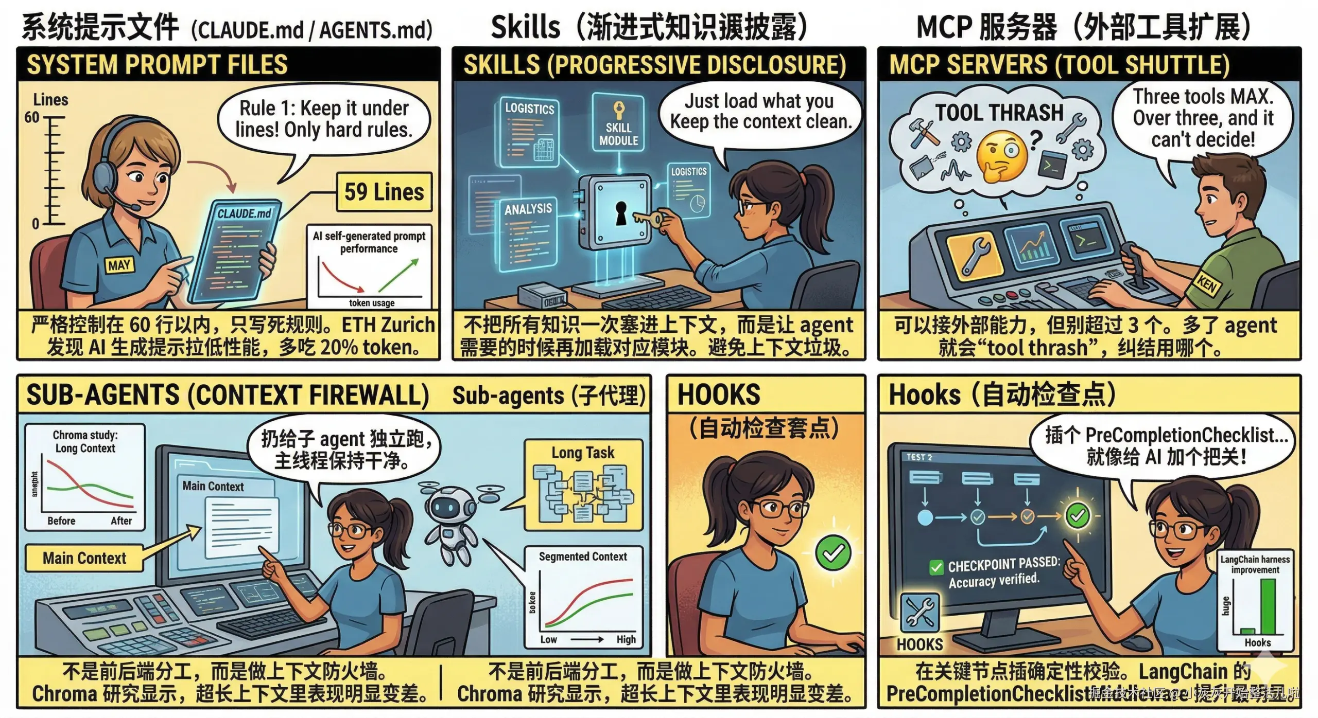 不把所有知识一次塞进上下文,而是让 agent 需要的时候再加载对应模块。避免上下文窗口被垃圾信息占满。