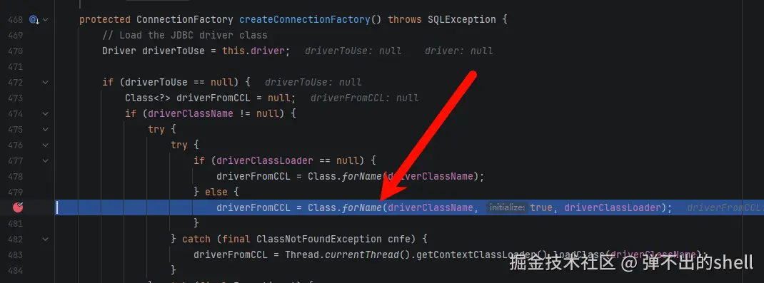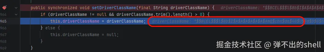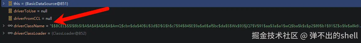 可以看到传进来的参数 driverClassLoader: ClassLoader@852,是一个真实的 BCEL ClassLoader 实例,不是 null,赋值前 this.driverClassLoader 是 null,这行执行完就注入进去了。