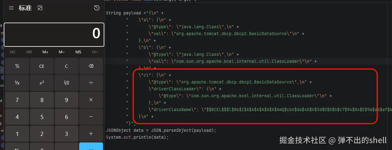 因为用的是 1.2.47 版本的 FastJSON,payload 比较长,但关键是 c 里的内容,a、b 都是为了写入缓存绕过检测机制(缓存绕过原理在上上篇已经详细分析过了):