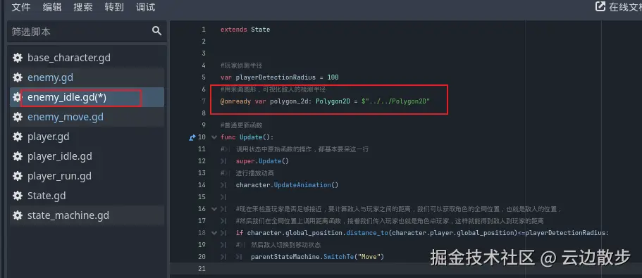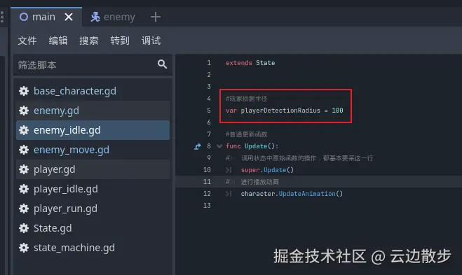 - 敌人检测玩家的能力然后敌人将切换到移动状态,试图追玩家。首先我们回到敌人待机状态脚本中,在顶部添加一个新的变量是玩家侦测半径