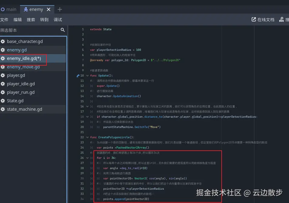 - 我们是在inter函数中进行使用绘画而不是update函数中做这个操作这样敌人进入空闲状态时我们只绘制一次圆形。