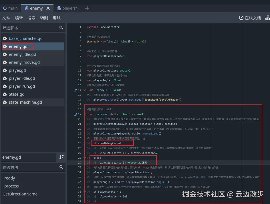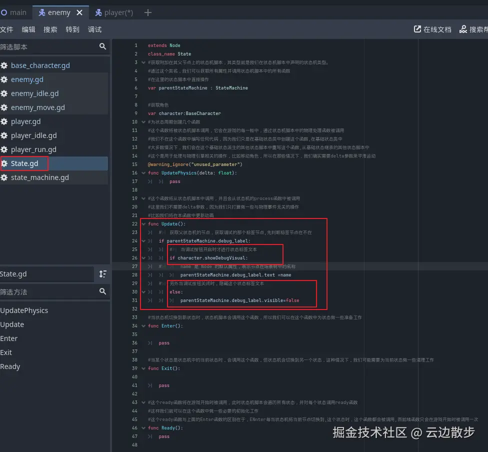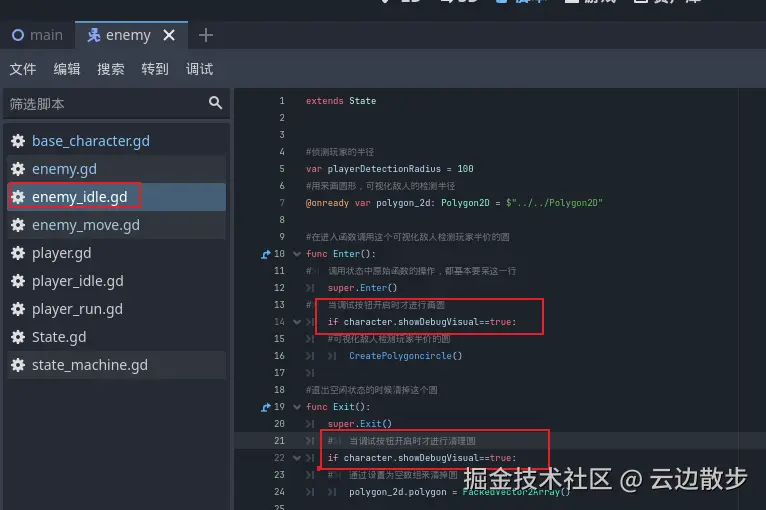 - 然后我们回到待机状态脚本中,我们在进入函数添加一个if检测,只有在showDebugVisual为true时才创建圆圈以及清理圆