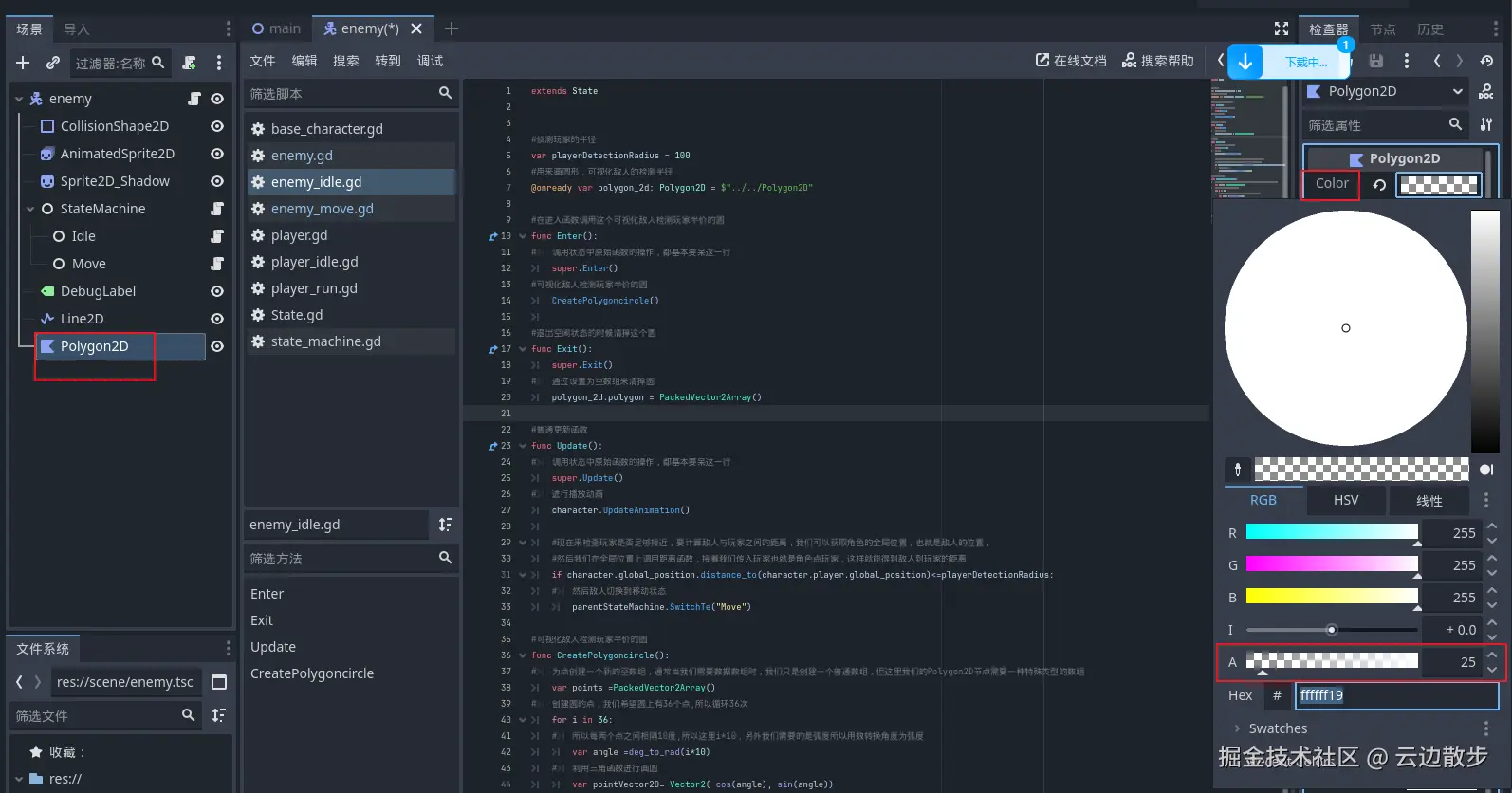 - 接着我们来可视化一下敌人的侦测半价,然后后面就可以用这个技巧来可视化游戏中你想查看的其他属性。我们回到敌人场景在根节点添加一个新的子节点Polygon2D