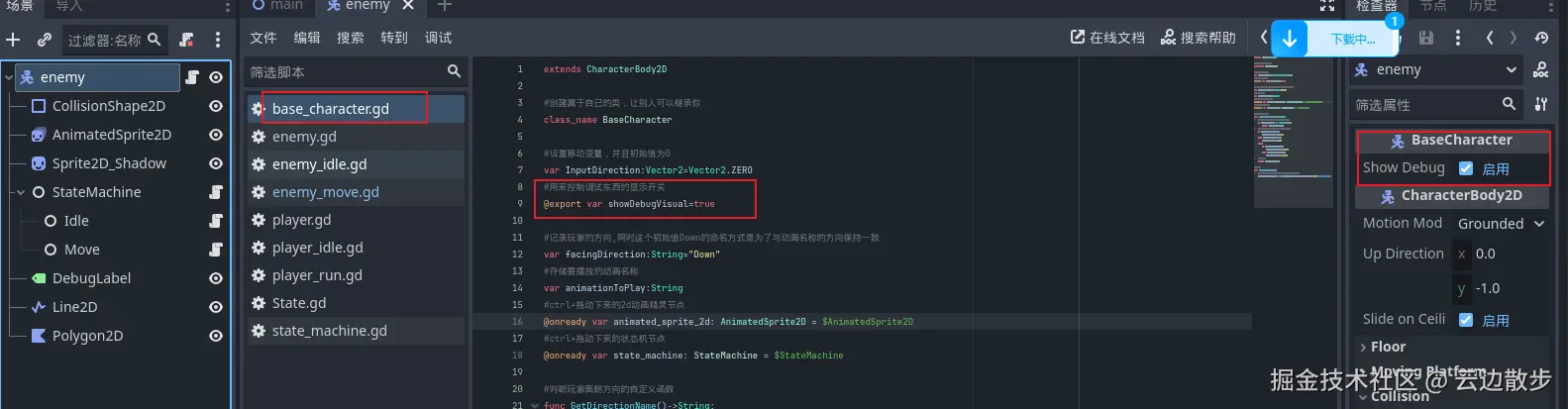 - 然后我们调试的东西往后会越来越多,所以我们需要有一个开关的选项进行控制调试信息的显示!我们去基础角色脚本里添加一个变量来实现这个功能。