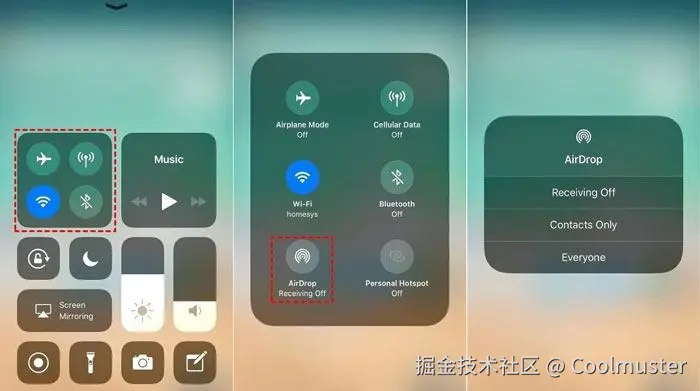 步骤 1. 从 iPhone 屏幕右上角向下滑动以访问控制中心。然后,点击并按住连接部分,然后点击“AirDrop”。您可以选择从“仅限联系人”或“所有人”接收文件。 (仅 AirDrop 联系人不起作用?)
