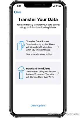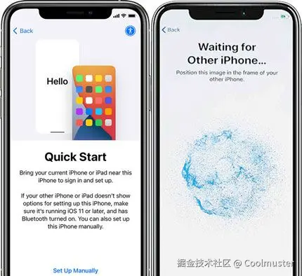 如果您有两台均支持iOS 11或更高版本的设备,您可以使用快速入门来快速迁移数据。快速启动通过蓝牙和 Wi-Fi 自动连接两个设备,无需任何外部设备或计算机。