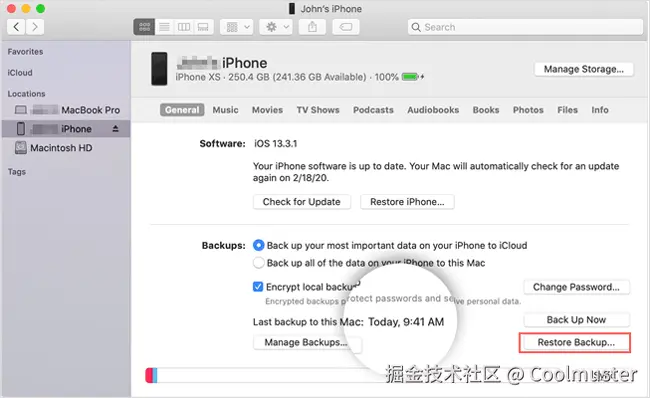 步骤4.单击“常规”选项卡,然后单击“恢复备份”并选择刚刚创建的备份。然后,如果出现提示,请输入密码并等待恢复完成。