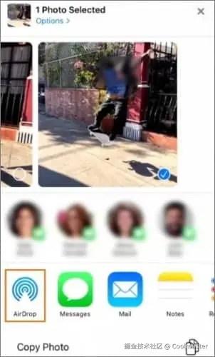 步骤2.在源iPhone上,选择要共享的数据,点击“共享”按钮,然后查找“AirDrop”部分。如果目标 iPhone 就在附近并且启用了 AirDrop,您应该会看到它的名称和图标。