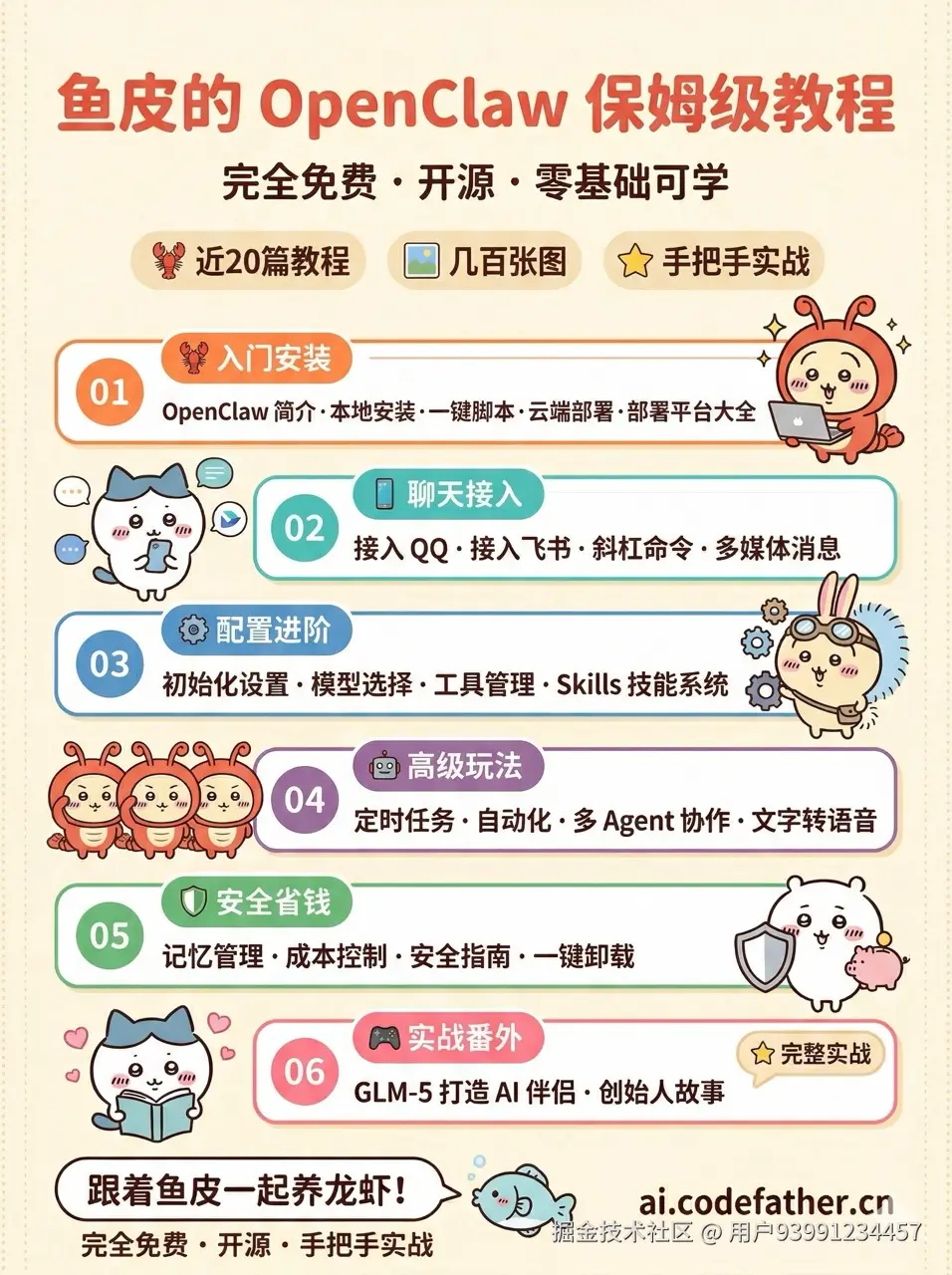 为了帮大家更好地玩转 OpenClaw,鱼皮写了一整套 《OpenClaw 保姆级教程》,近 20 篇从入门到进阶的完整教程,涵盖安装部署、聊天接入、模型切换、技能系统、多 Agent 协作、安全防护等方方面面,完全免费开源,欢迎大家阅读。