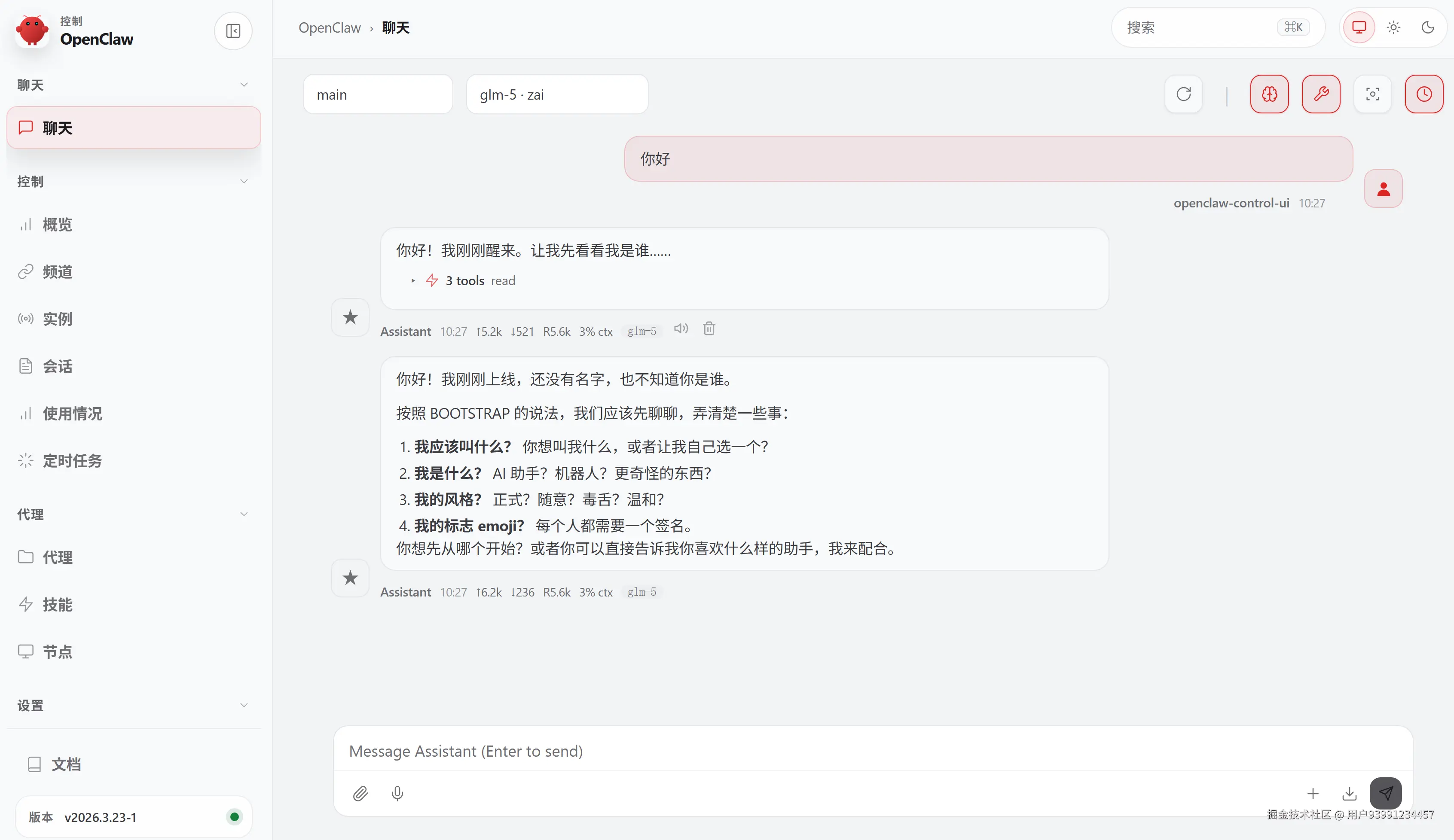 5)最后,正常情况下,会自动打开 OpenClaw 管理网页,你的小龙虾前来报到: