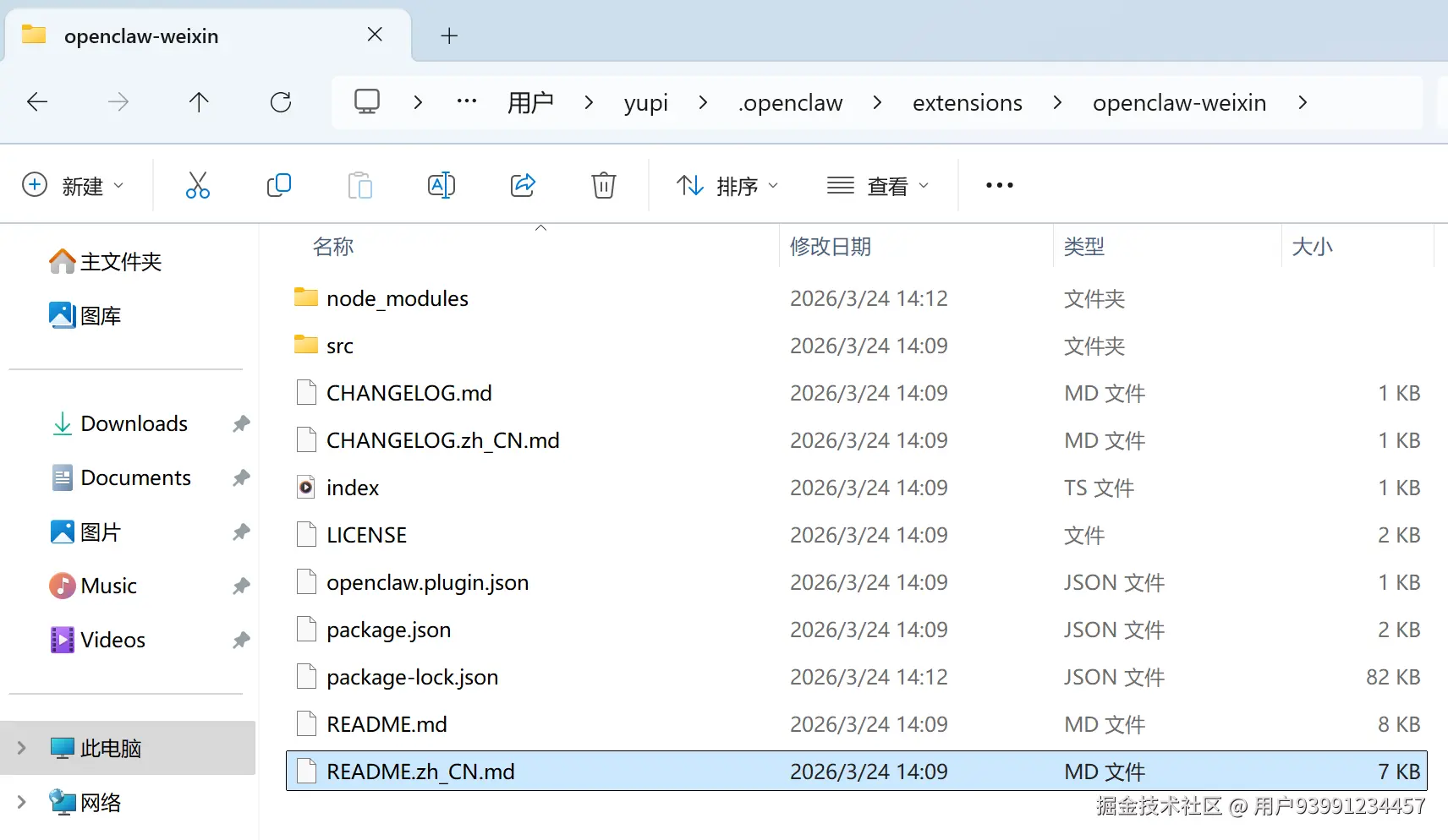 安装完插件后,你可以在 OpenClaw 的插件目录下找到 openclaw-weixin 相关的源码和 README.md 介绍文档,感兴趣的同学可以翻一翻: