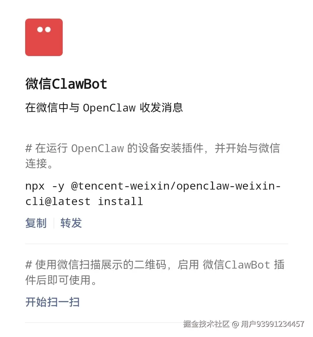 进入插件详情,可以看到官方给出了接入微信 ClawBot 的指引: