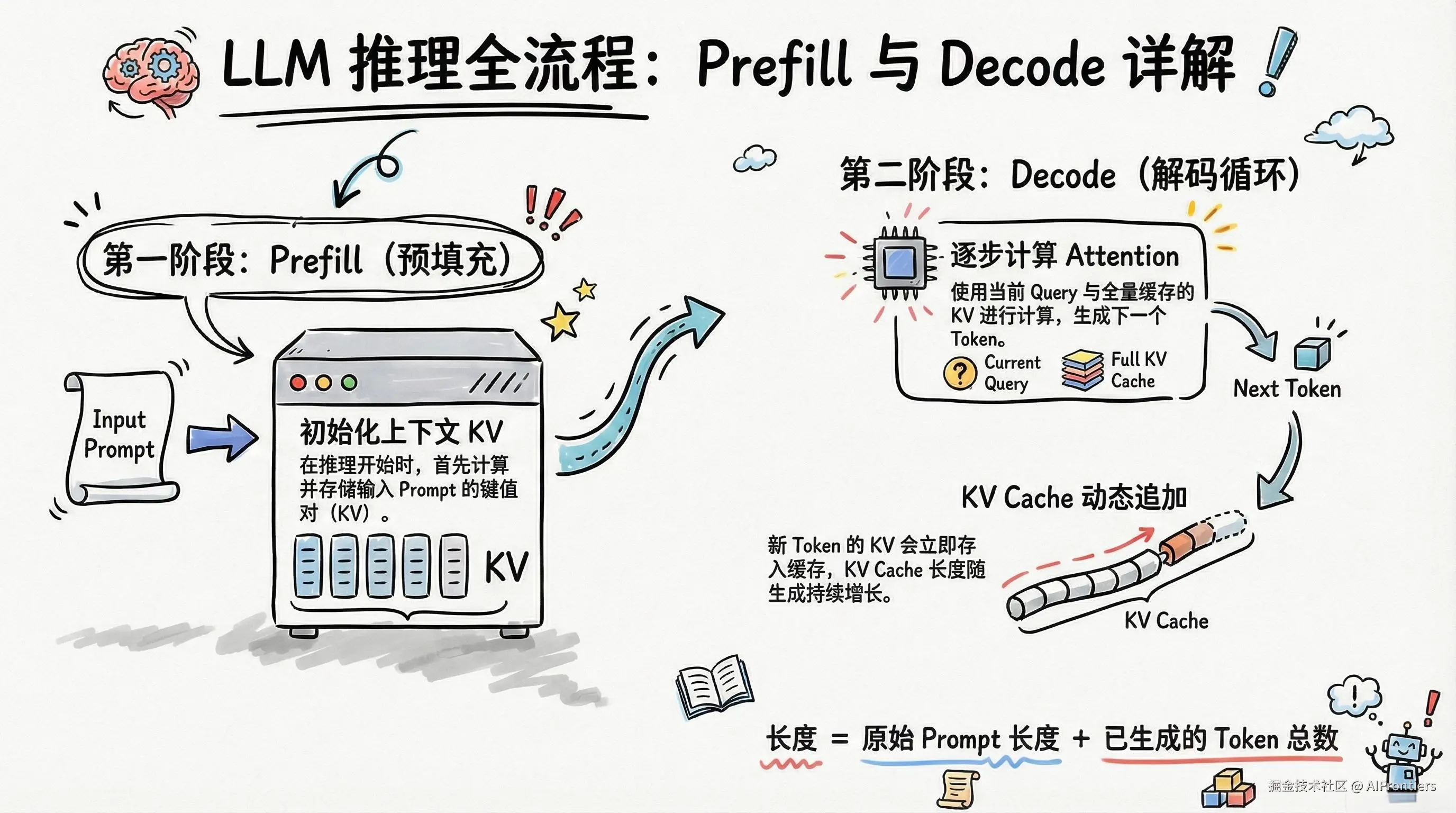 Decode阶段:后面生成新词元时,只需要算当前词元的Query,再和缓存里的K、V做计算就行
