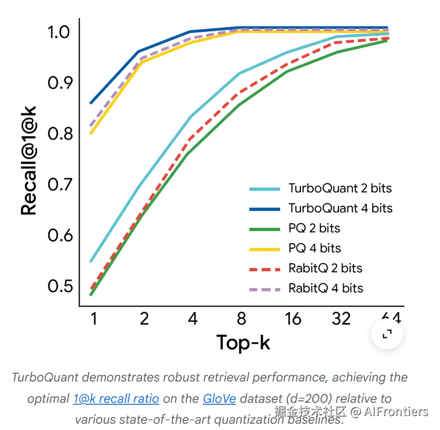 除了LLM推理,TurboQuant在向量数据库检索(Semantic Search)中也展现了卓越的性能。在GloVe等标准数据集上,TurboQuant的1@k召回率始终优于传统的乘积量化(PQ)和RabbiQ方法。更重要的是,由于其「数据无关」的旋转特性,TurboQuant几乎不需要索引构建时间,非常适合数据频繁变动的实时搜索场景。