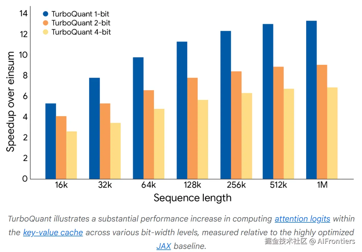 TurboQuant证实,其可将KV缓存量化至仅3bit,无需训练与微调、不损失模型精度,且推理速度快于原生 Gemma、Mistral等大模型;整体实现高效,运行时开销近乎可忽略。在H100 GPU上,4位TurboQuant相较32位未量化KV缓存,注意力计算速度提升达8倍,下图直观呈现了这一速度增益。