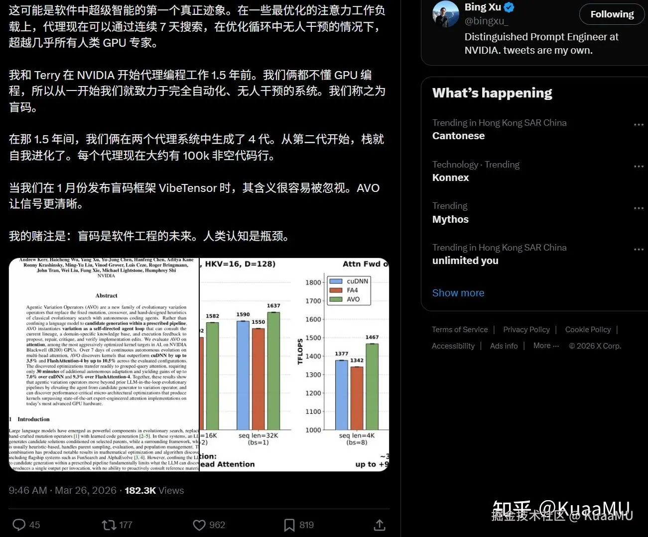 这0.5秒里发生了什么?我后来试图还原。他先看到作者列表里有Bing Xu的名字,那个在X上很活跃的研究员。然后他看到摘要里的数字:7天,500多个优化方向,超越FlashAttention-4最高10.5%。最后,他可能和我做出了同样的反应:去搜Bing Xu的推特。