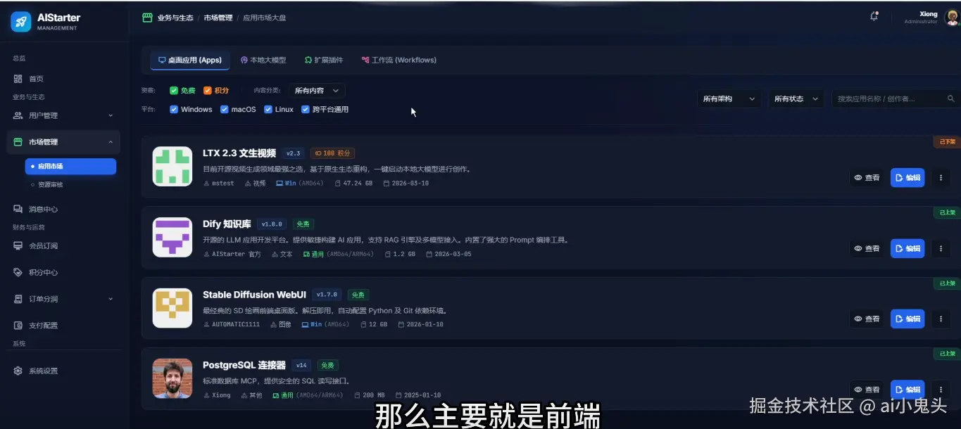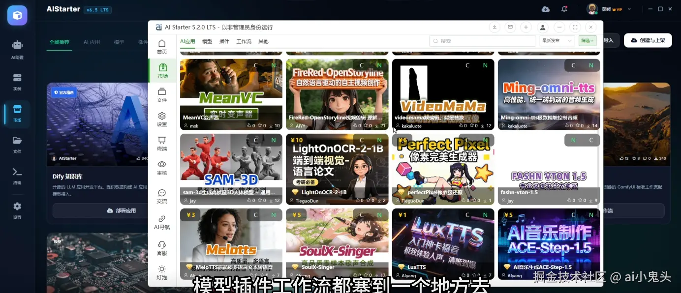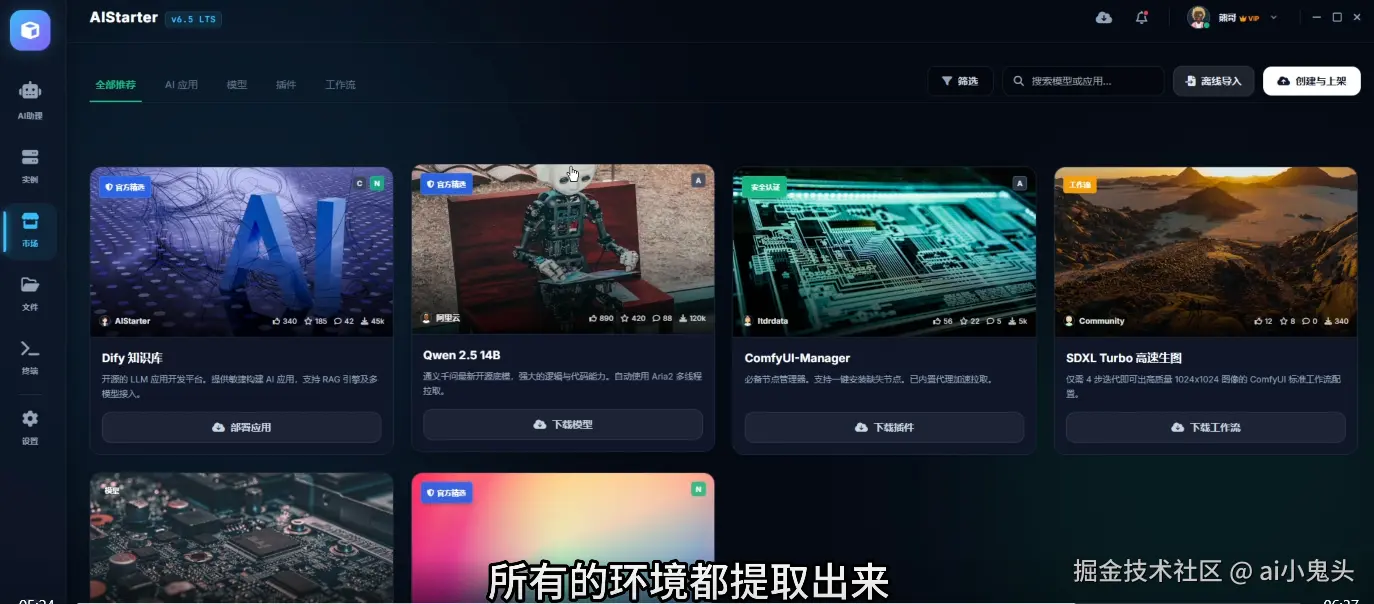 最近刷到熊哥最新视频,AIStarter新版后端原型图正式亮相。这次不是简单的UI美化,而是前端到后端、业务逻辑到部署流程的彻底架构升级。旧版那种“每次上新作者反复打包、模型插件工作流全塞一个包”的笨重模式,终于被彻底解决——新版实现了环境共享却严格隔离,真正让本地AI项目“开箱即用、更新及时”。