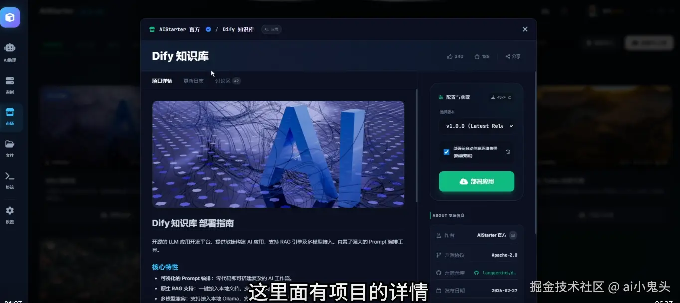 旧版AIStarter虽评价不错,但市场维护成本高、下载体积大、环境冲突频发。新版把所有环境提取共享 + 隔离部署,点进项目即可选取版本一键部署,下载只需32~100+MB,支持IPv6或离线模式,安装后直接启动。界面黑白切换依旧丝滑,但使用方式和管理模型完全不同——作者不再反复更新打包,用户也不用担心版本混乱。