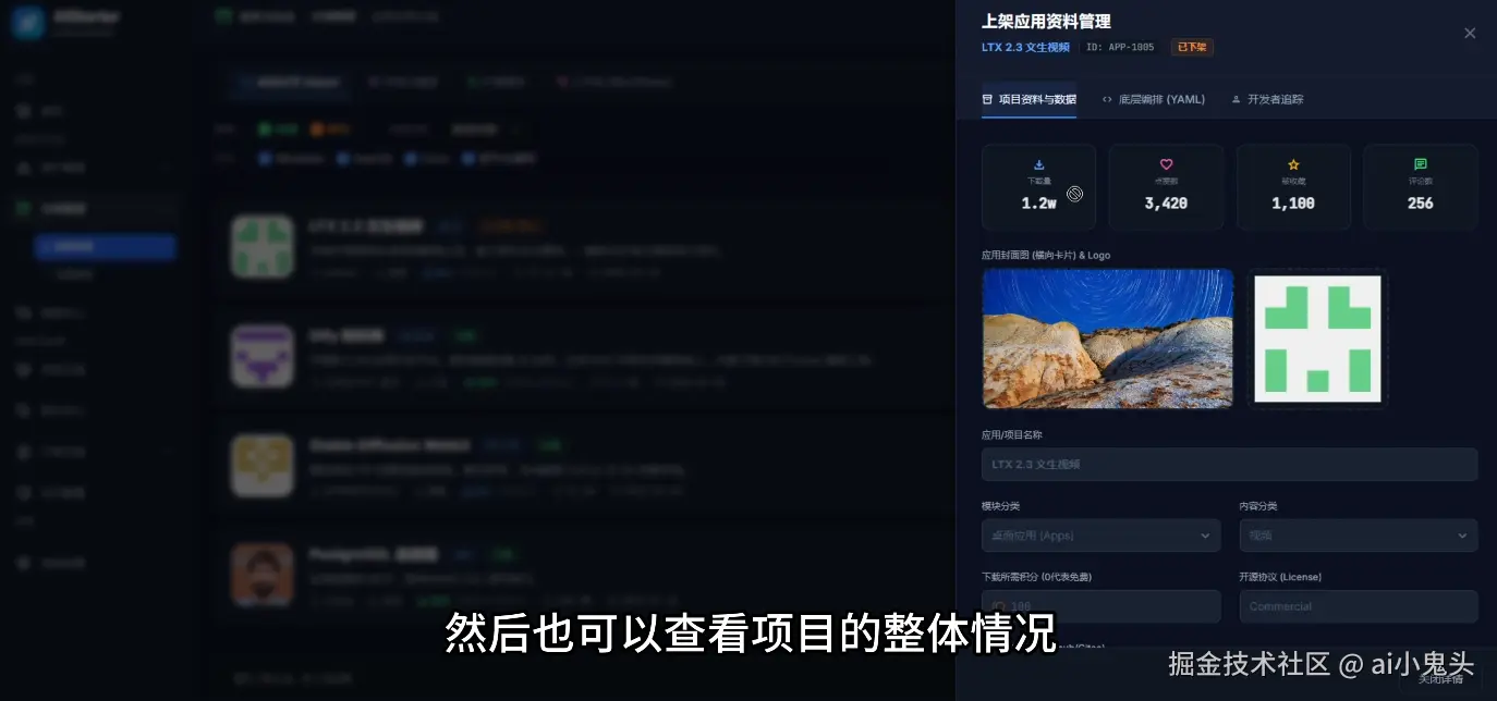 审核与运营:支持随时下架 / 锁定存档 / 删除,开发者能实时查看前端上传的项目全貌,模型 / 插件 / 工作流分类清晰,不再项目与资源割裂。