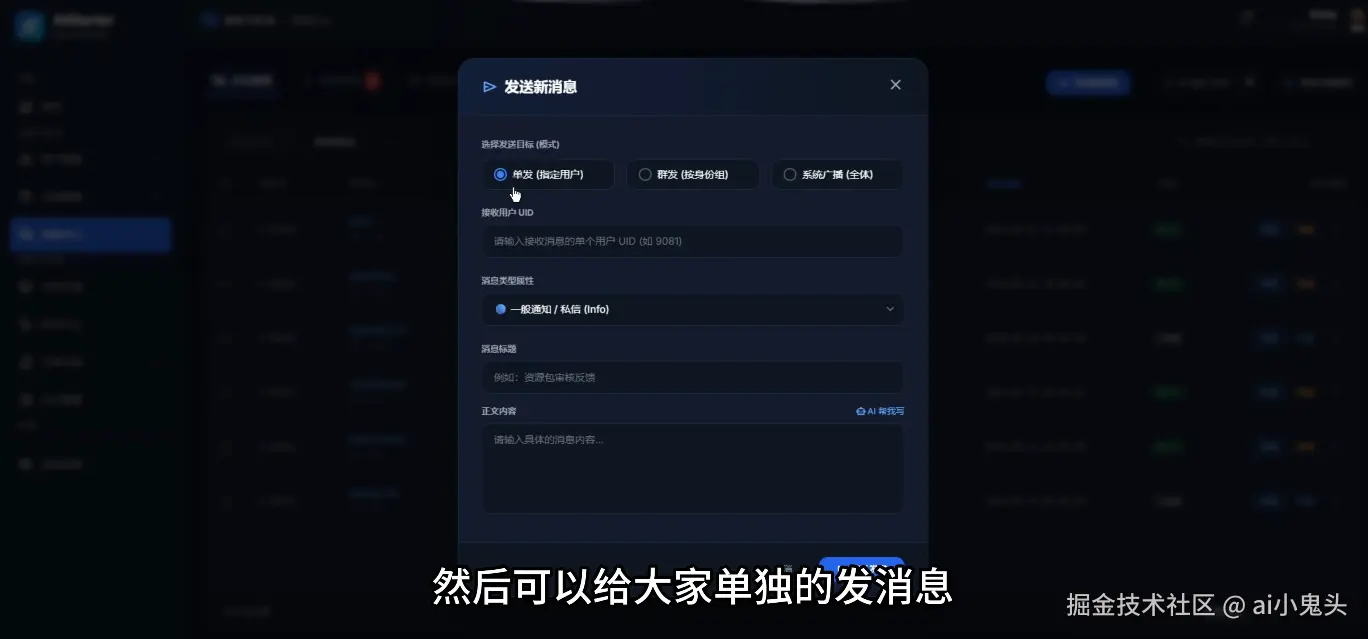消息中心:评论管理、违规举报、私信群发、系统广播全覆盖,更重磅的是接入大模型AI巡查,自动识别恶意攻击并一键封禁,拉黑更安全。