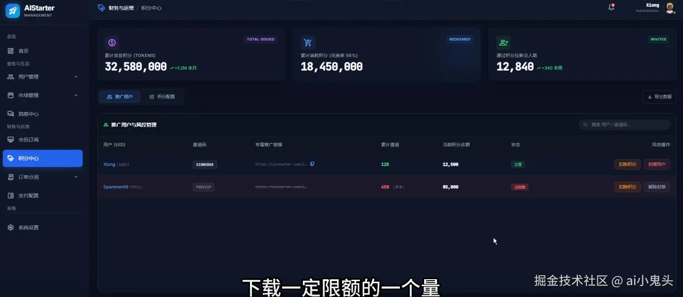 - 会员与积分体系:基础版基本免费,年度订阅、AIStarter永久版;不愿付费的用户每天赠送积分,新注册用户默认免费下载限额,零套路直接使用。订单分润、支付配置、系统安全设置也一应俱全。