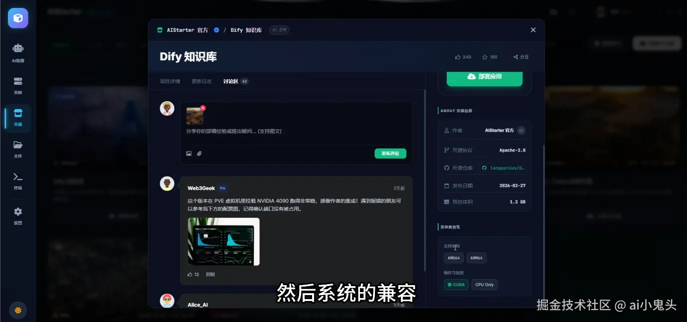 - 市场管理:所有模块已完善,前端可直接创建项目,后端统一审核上架。项目详情页包含更新日志、讨论区、版本管理、点赞收藏分享、一键部署,开源协议、发布地址、体积、系统兼容性等信息一应俱全。
