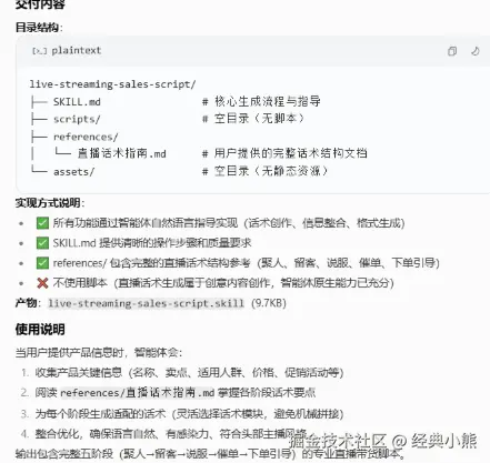 最后扣子编程平台会明确提示“Skills已创建完成”,并生成一份清晰的实现概览、交付内容和使用说明。接下来,用户只需在下方的消息输入框中发送测试提示词,即可立即验证该Skills的实际效果。