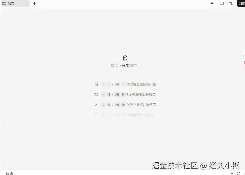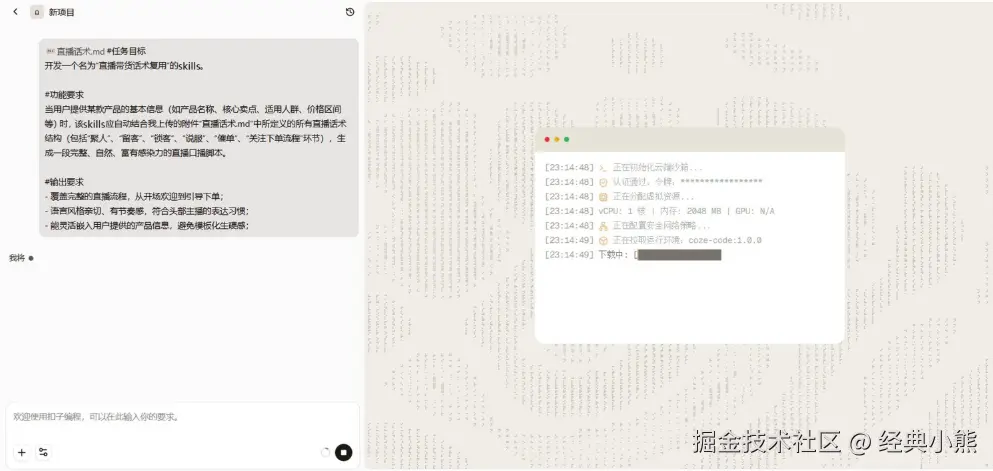 待初始化完成后,便会切换并提示“技能正在生成中”。这表示扣子编程平台正在自动化开发Skills。