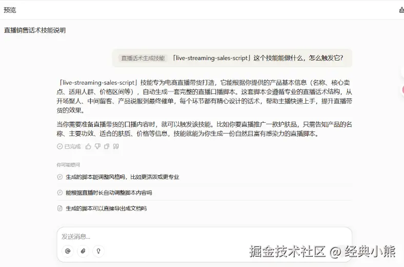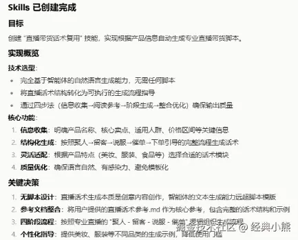 在传统的优秀主播经验传承中,行业常常面临以下两大痛点。• 会做不会教。许多优秀主播凭借直觉、天赋或长期直播的经验,打磨出高效的直播话术与节奏把控能力,但缺乏将这些隐性经验系统化、结构化表达的能力。他们或许能做好直播,却难以清晰拆解为何这样做,以及每句话术背后的策略是什么,导致其核心经验难以被他人有效学习和复用。• 经验高度依附于个体,极易随人员流动而流失。一旦核心主播离职,其积累的选品逻辑、用户互动技巧、促单话术等宝贵经验资产往往随之消失。继任者不得不从零开始,在一次次试错与实战中重新摸索,不仅拉长了继任主播的成长周期,也给团队业绩带来波动风险。而扣子平台Skills的核心设计理念,正是将可重复、可迁移的方法论封装为模块化的专家经验包,供智能体在具体任务中调用执行。因此,将直播带货话术复用开发为专属Skills,能够让直播带货话术不再仅依赖个人天赋,而是转换为可积累、可迭代、可智能调用的数字资产,真正实现把顶尖主播的经验,转换为团队可复用的核心能力的目标。