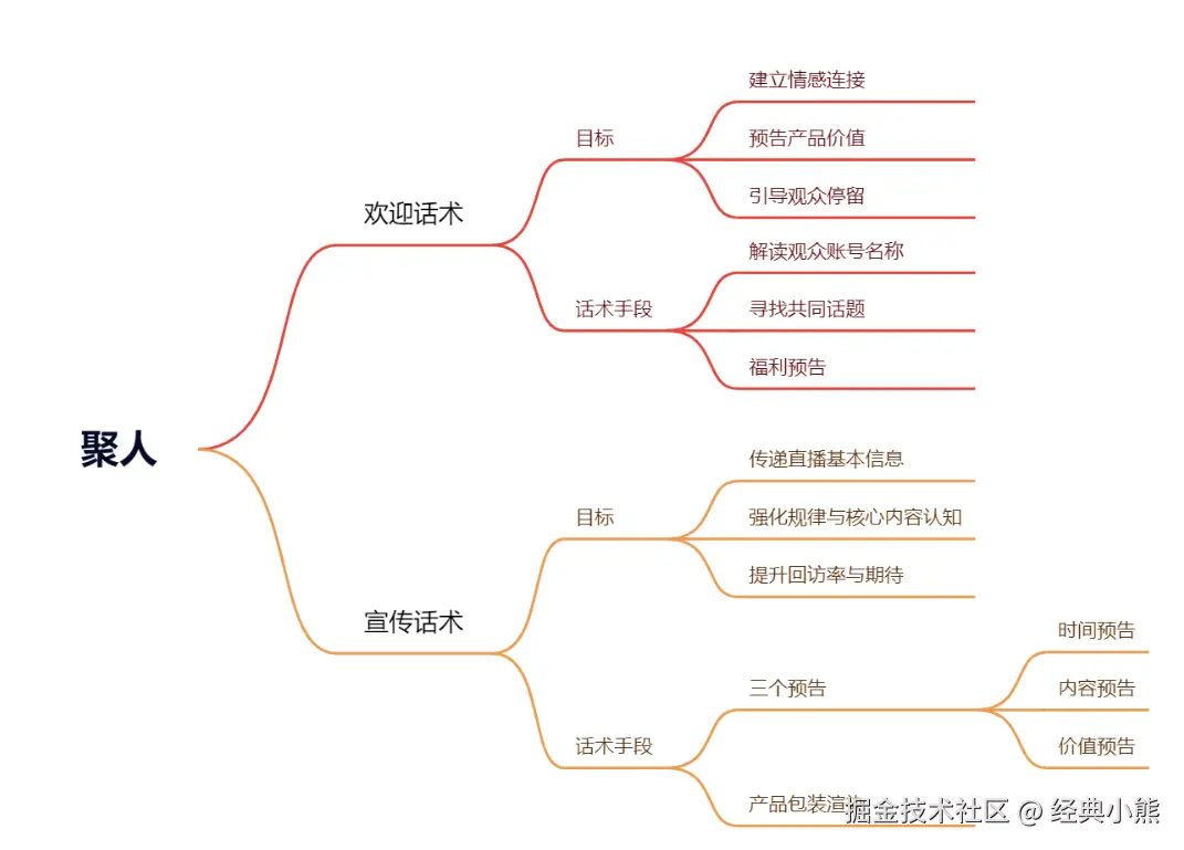 开发直播带货话术复用Skills的首要前提,是对优秀主播的话术模板进行结构化整理。本节将以一场直播中的聚人环节为例,介绍话术模板的构建方法。聚人环节的话术由欢迎话术与宣传话术两部分构成,具体如图所示。根据聚人环节话术的目标和分类,可以设计如下话术模板。