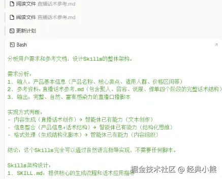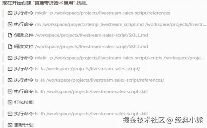 在Skills的开发过程中,扣子编程平台会自动完成一系列后台操作,首先是阅读文件环节,该环节会阅读并理解用户上传的“直播话术参考.md”文件,然后通过不断更新计划的方式动态生成开发计划。之后进入执行多条命令并创建文件,这些步骤的作用是创建Skills所需的各项目录及SKILLS.md文件,接下来执行打包技能步骤,这标志着Skills开发进入收尾阶段。