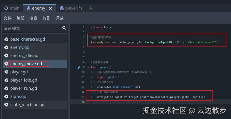- 在移动状态脚本中,我们按住ctrl键+拖动把NavigationAgent2D节点拖入敌人移动状态脚本中。并且先获取玩家角色的世界位置