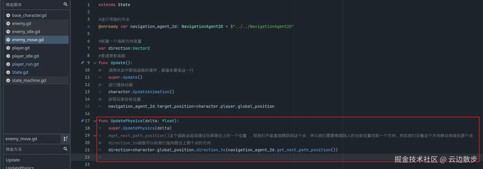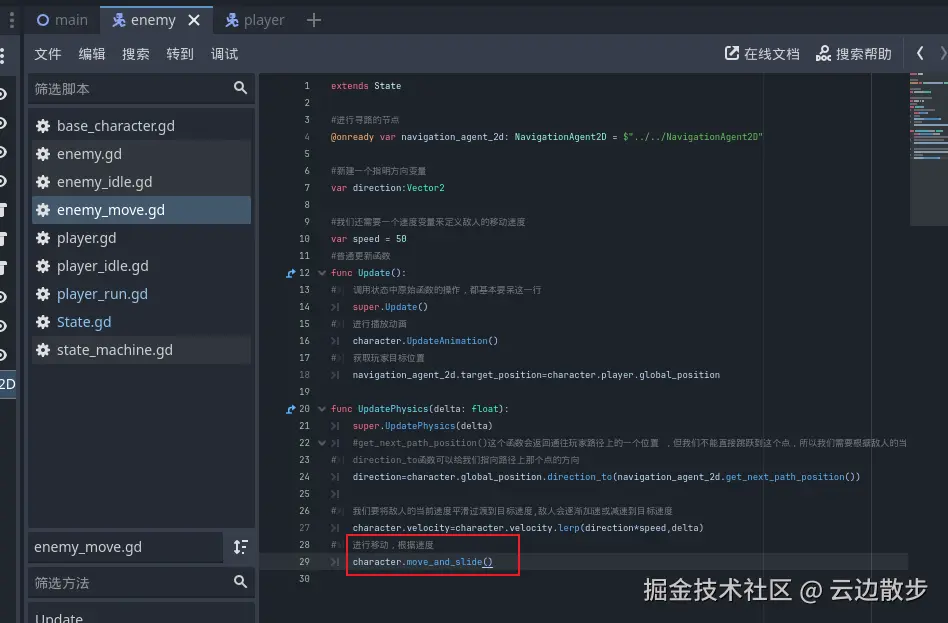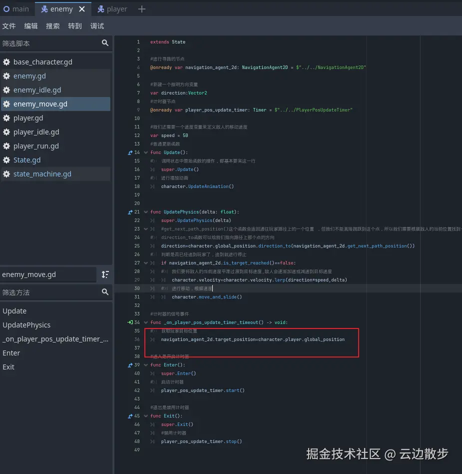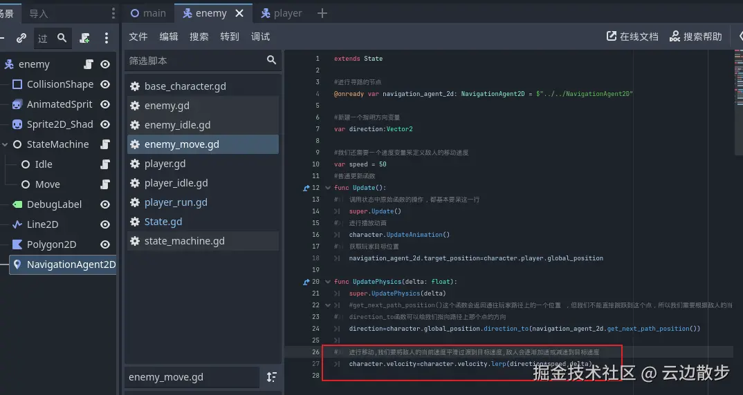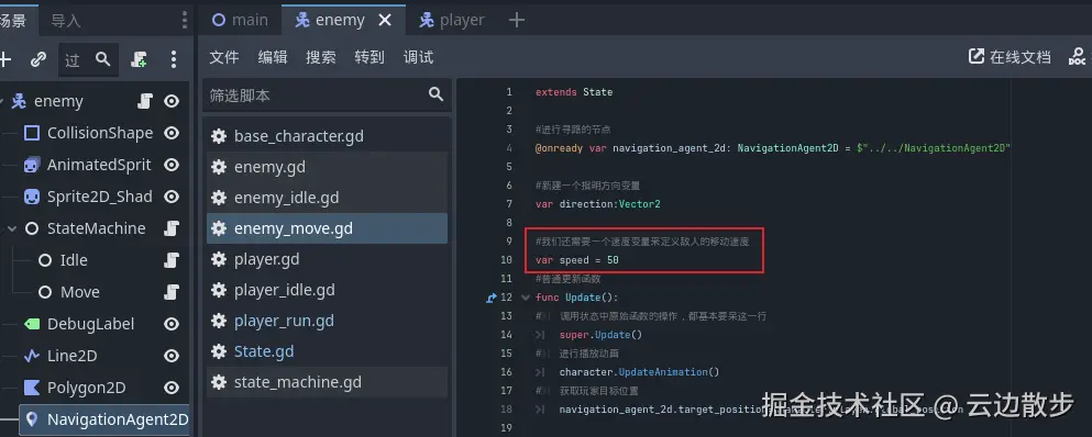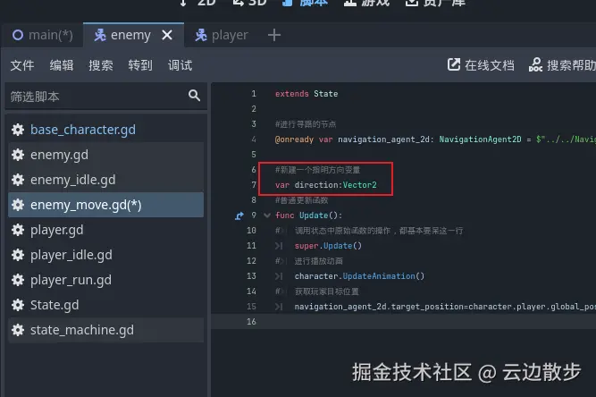 - 接下来我们让敌人进行动起来,我们上面获取了前往玩家的方向,我们只需要根据这个方向来更新敌人的速度就好,