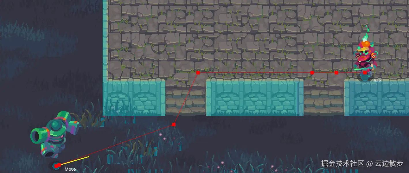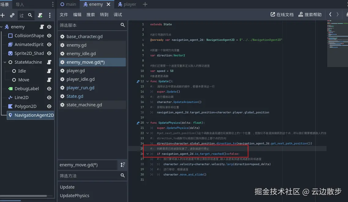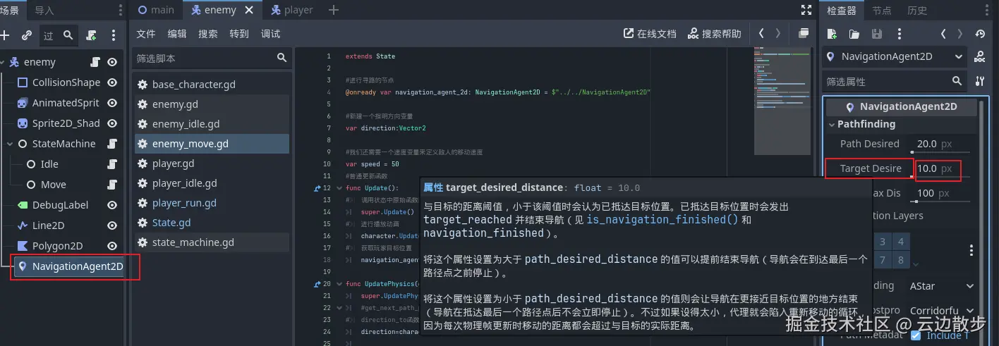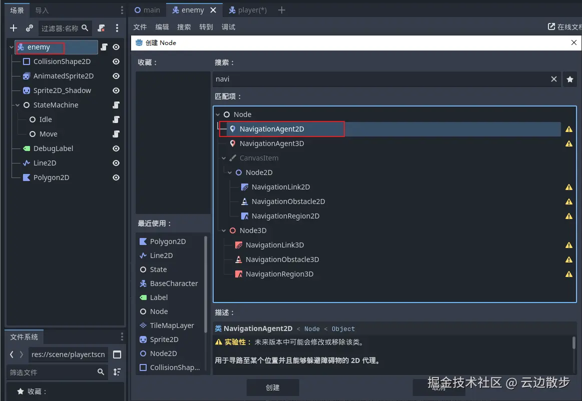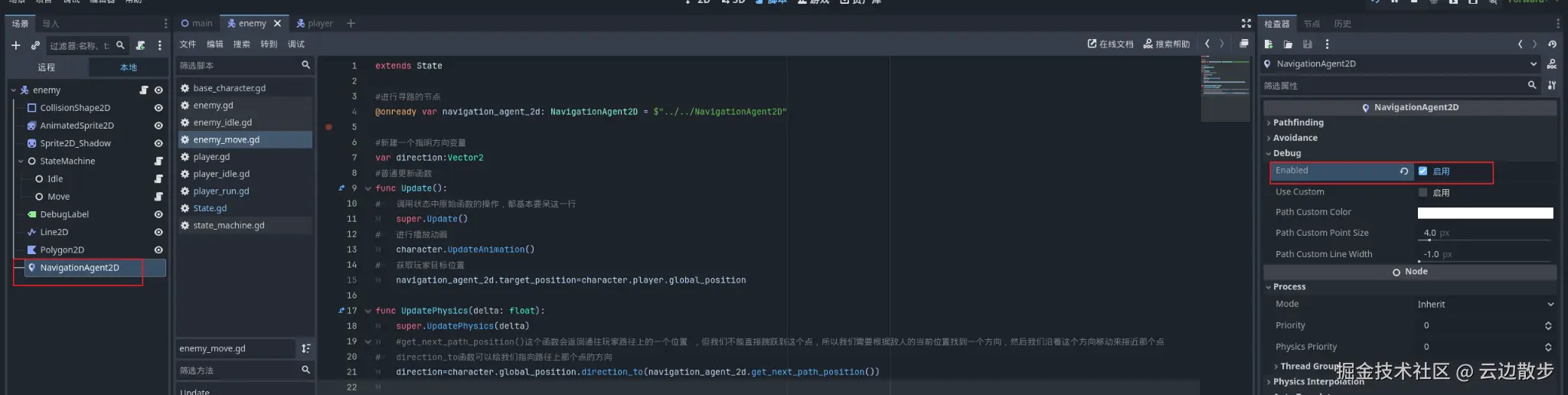 - 为了让导航系统正常工作,我们需要在敌人场景中添加一个NavigationAgent2D节点,NavigationAgent2D节点定义了敌人寻路过程的行为