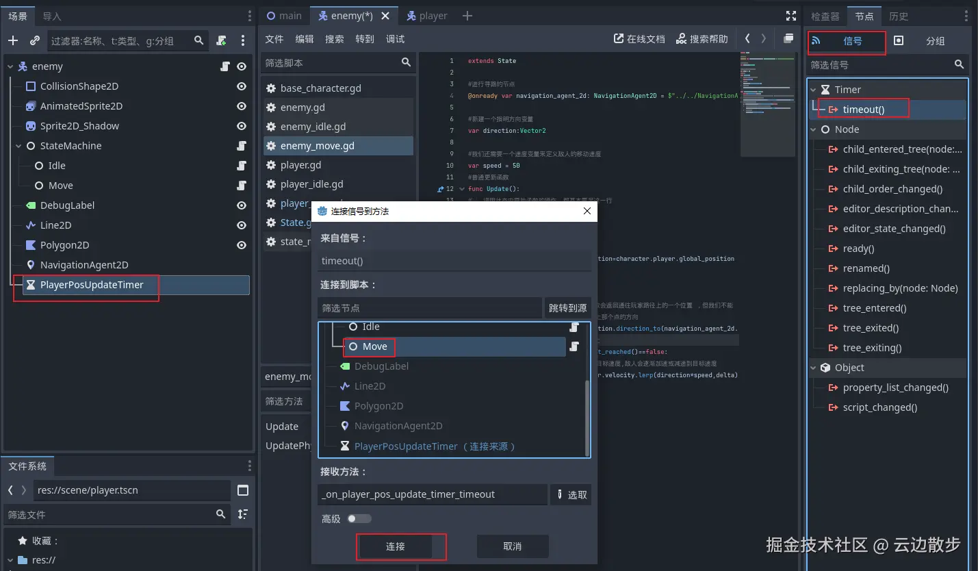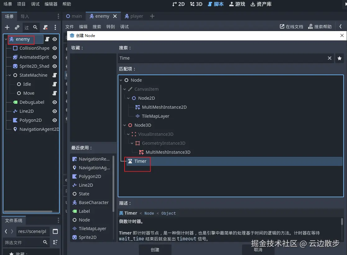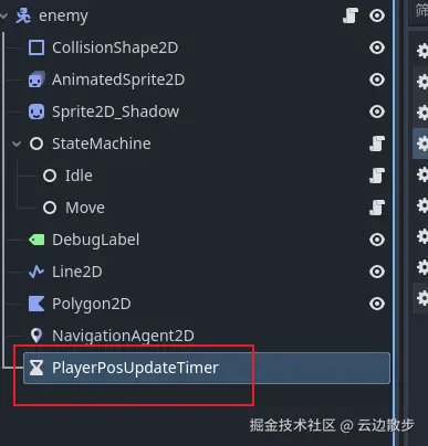 - 我们在敌人场景添加新的节点,计时器节点,重命名为PlayerPosUpdateTimer