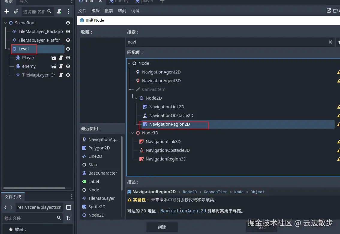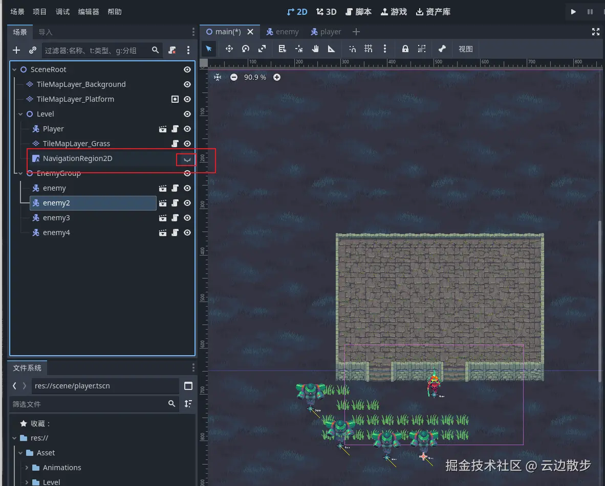 - 然后我们还需要一个NavigationRegion2D节点,在我们的游戏场景中,NavigationRegion2D定义了敌人可以移动。所以我们切换到主场景的关卡节点下进行添加