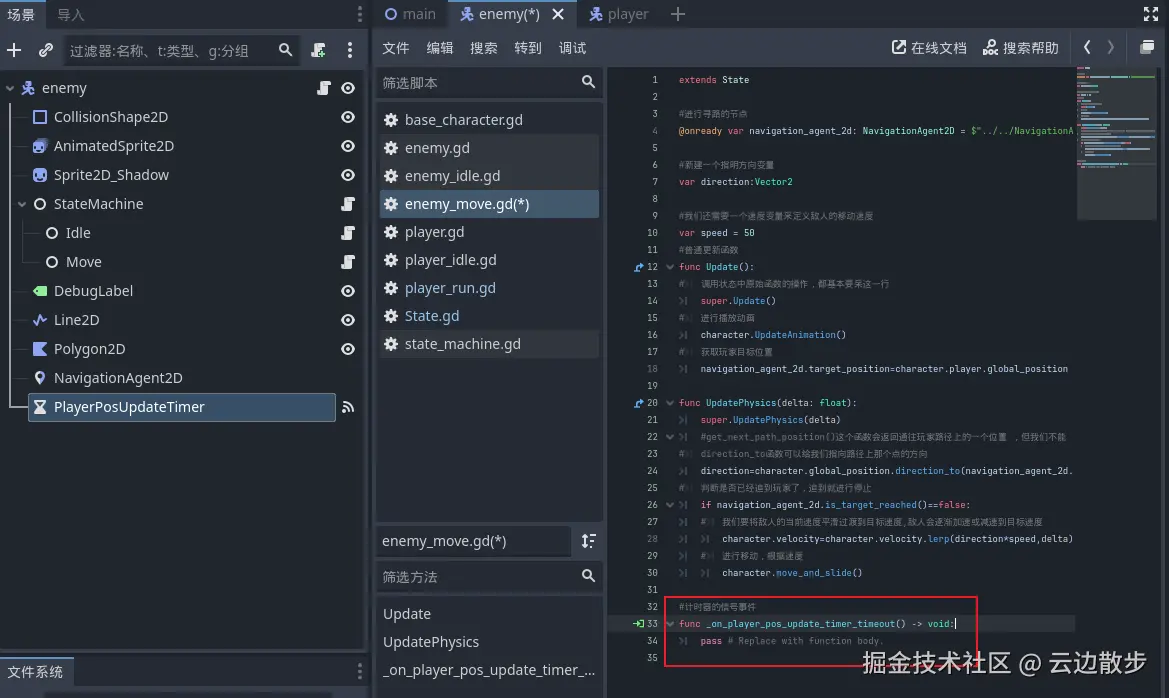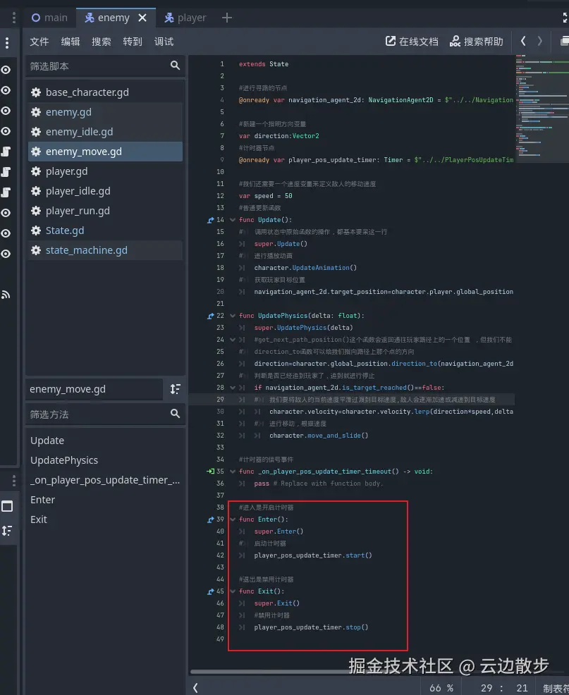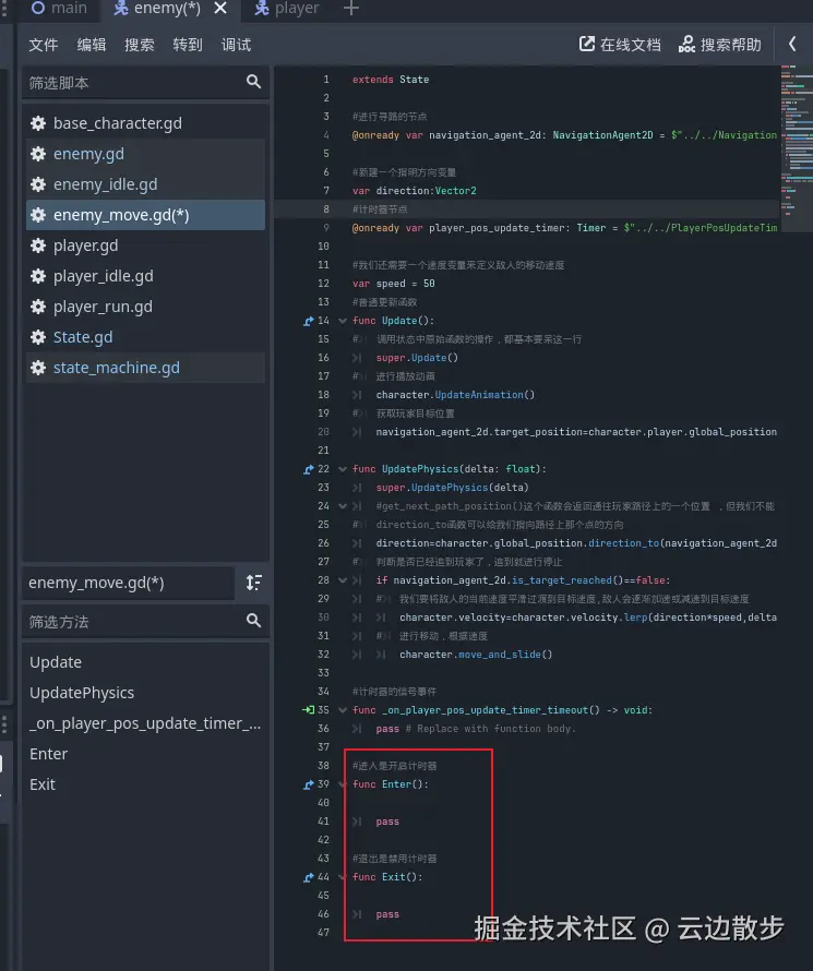 - 我们只希望敌人在移动状态时计时器才工作,让我们重写enter函数和exit函数,进行进入是开启计时器,退出是关闭计时器