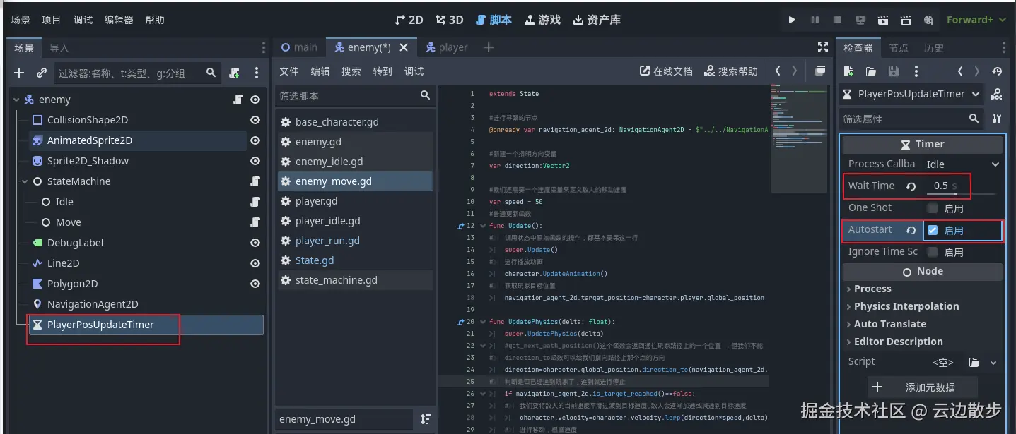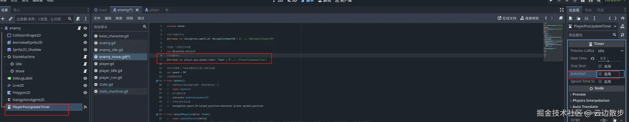 - 然后我们ctrl+拖拽将这个计时器节点拖拽到这个敌人移动状态脚本中,并且关闭自动启用属性