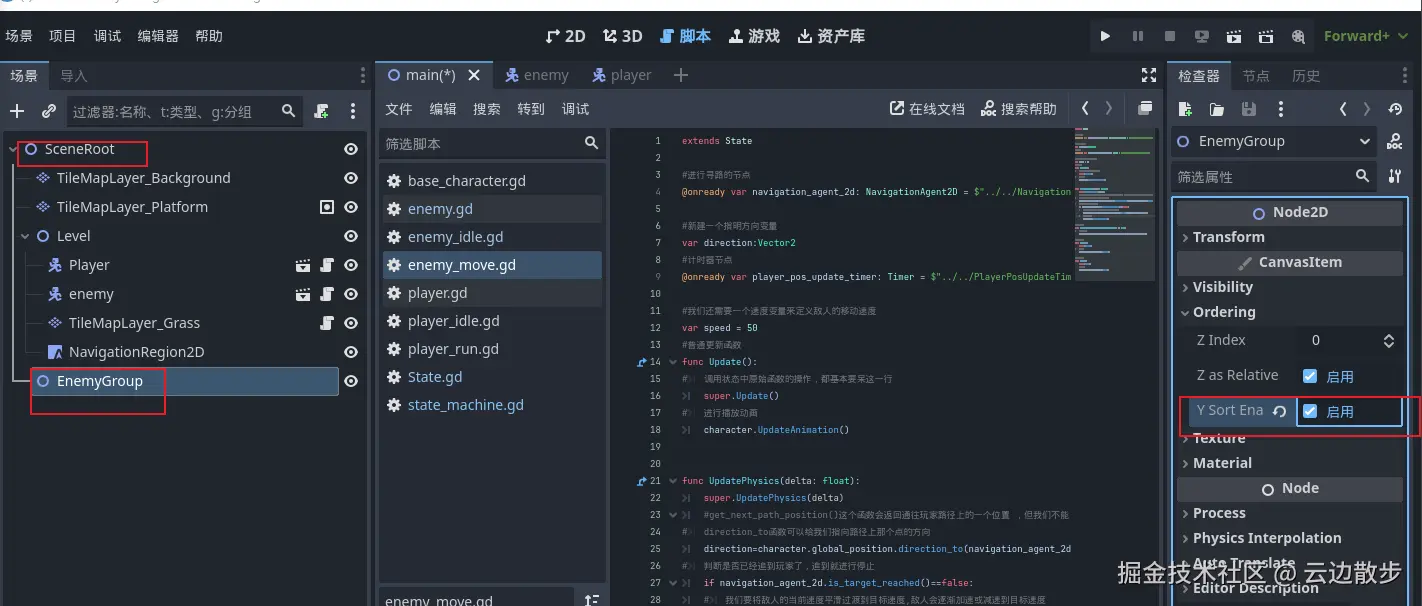 - 然后接着我们来在主场景中创建一个敌人的分组,我们创建多个敌人放进去这个分组里,我们先创建一个新的node2d节点重命名为EnemyGroup节点并且开启按照y轴进行排序