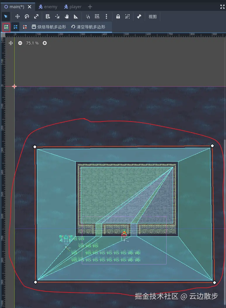 - 接着我们隐藏一下这个2d导航区域,注意这个区域就是敌人会追踪的区域,相当于追杀范围,离开这个范围敌人就不会进行追杀了