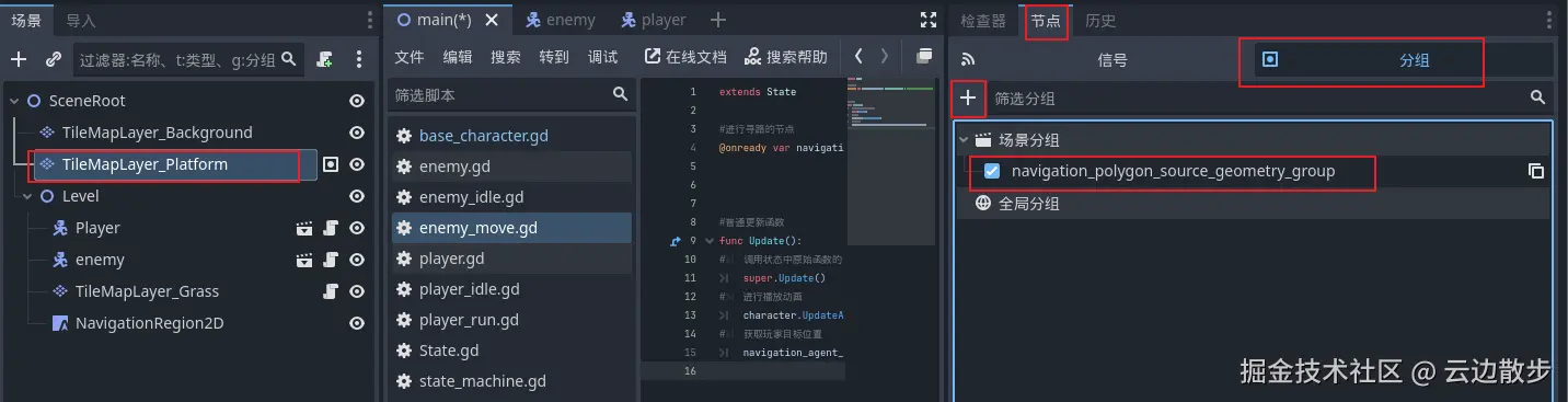 - 这个NavigationRegion2D只会处理标记了这个组名的节点的名字,让我们复制这个组名,并将其添加到TileMapLayerPlatform节点上